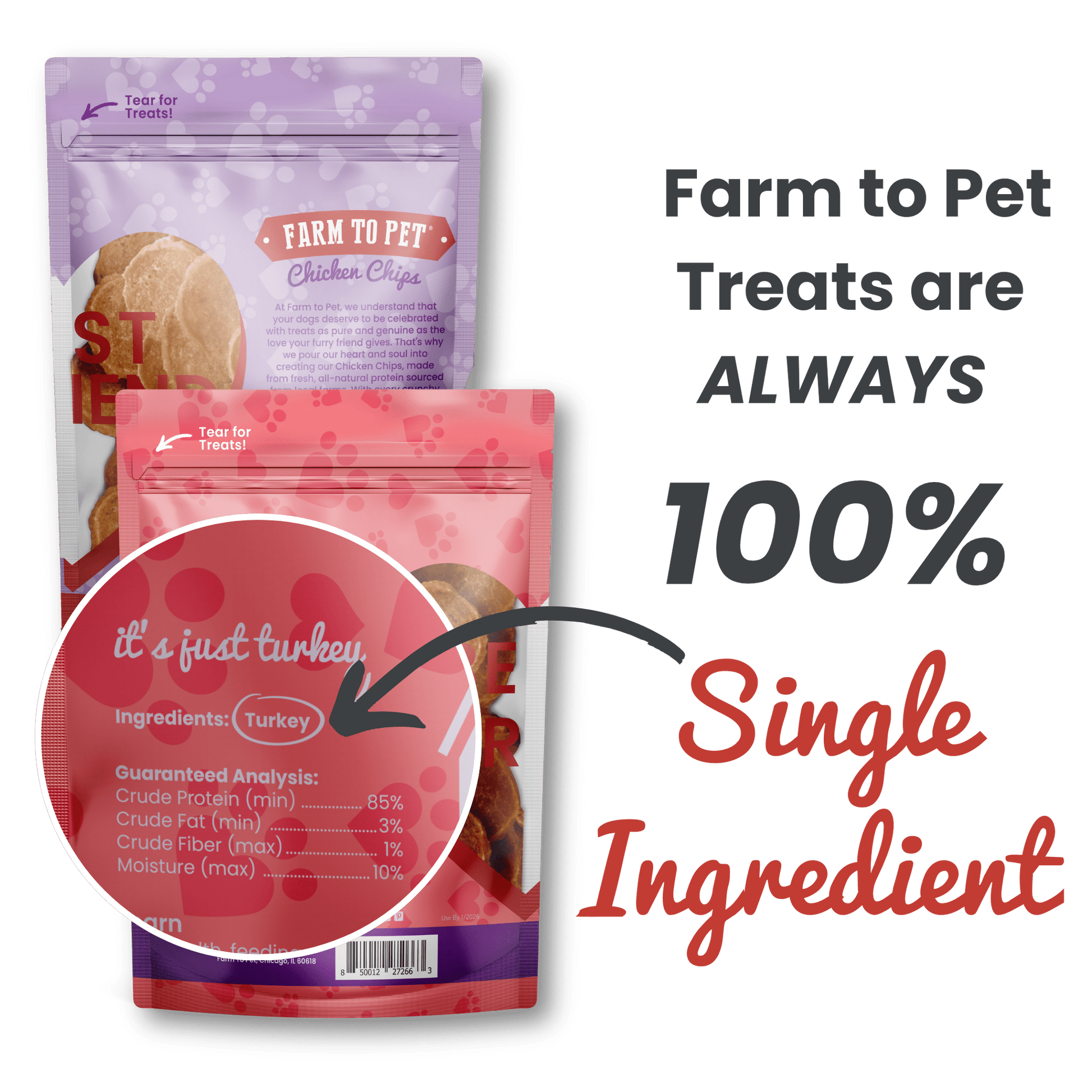 There are high-quality pet treats, and then there are Farm to Pet Chicken and Turkey Chips. Lovingly made in the USA with nothing but pure poultry breast, each crunchy bite provides a healthy dose of protein, amino acids, B vitamins and minerals. Plus, our nutritious treats for dogs are all-natural and naturally low in fat, calories and allergens. What's not to love?